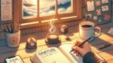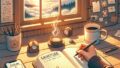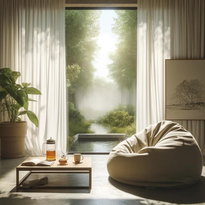 窓からは緑豊かな庭が見え、安らぎの雰囲気を高めている。部屋の中央には、ゆったりとした大きめのビーンバッグと小さな木のテーブルが置かれ、ハーブティーの入った湯気の立つマグカップと開いた本が置かれている。柔らかな照明が穏やかな日差しを引き立て、すべてを暖かく照らしている。壁には、静けさを感じさせるミニマルなアートが飾られている。