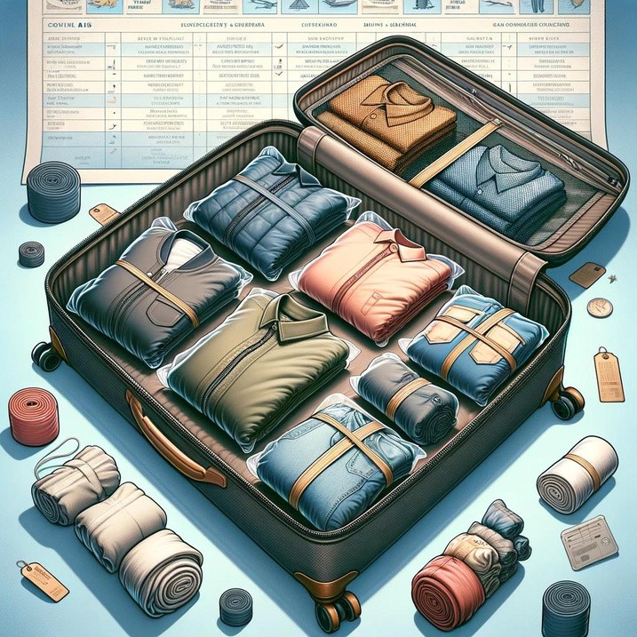 この方法はスペースが広くなるだけでなく、持ち物が整理できて取り出しやすくなります。このセットアップは、旅行に圧縮袋を使用する効率性と省スペースの利点が得られ、すべてがコンパクトで簡単に出し入れできるようになります。